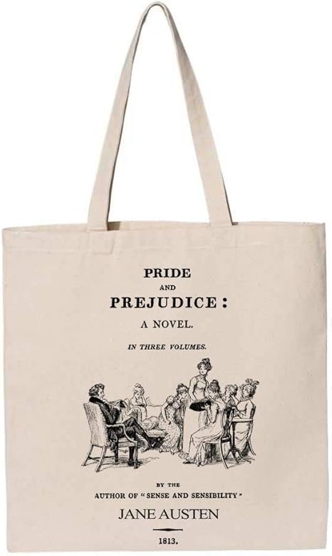 - A classic 1813 novel written by Jane Austen “Pride and Prejudice” title page printed on a 100 % cotton canvas tote bag.