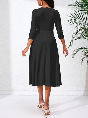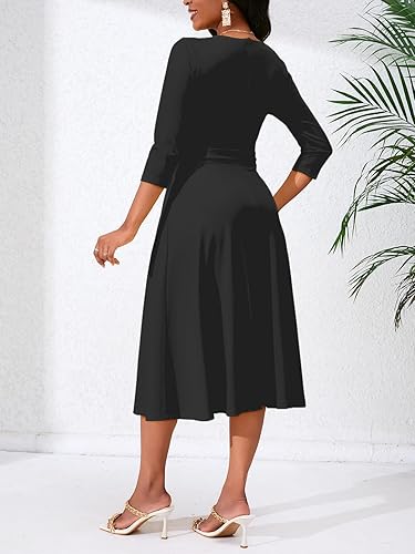 Women’s Casual A-Line Dress Wedding Guest Cocktail Church Flare Swing Midi Dresses with 3/4 Sleeve V-Neck Belted